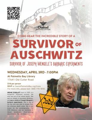 Chabad of Palmetto Bay, presents an evening with Holocaust survivor Irene Zisblatt. Her harrowing story of survival amidst the terror of Auschwitz's infamous "Angel of Death," Dr. Josef Mengele, starkly highlights the depths of