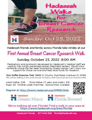 - 2022-10-23 08:00:00 2022-10-23 08:00:00 America/New_York Hadassah Walks for Breast Cancer Research Hadassah friends and family all over Florida take strides at our first annual Breast Cancer Research Walk. Join friends and family all over Florida for our first annual Hadassah Walks for Breast Cancer Research! (http://preview.jewishmiami.org/events/hadassah_walks_for_breast_cancer_research) The Don Sofer Exercise Trail, Aventura, FL 33180 florida@hadassah.org
