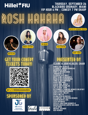 - 2024-09-26 18:00:00 2024-09-26 18:00:00 America/New_York Rosh Hahaha 2024 Join us for a night of comedy and fun at Rosh Hahaha, which supports the programming at Hillel at FIU, which strives to mold our local college students into community leaders. (http://preview.jewishmiami.org/events/rosh_hahaha_2024) Blackbird Ordinary, Miami, FL 33130 Rachel Gordon jon.warech@hillelfiu.org